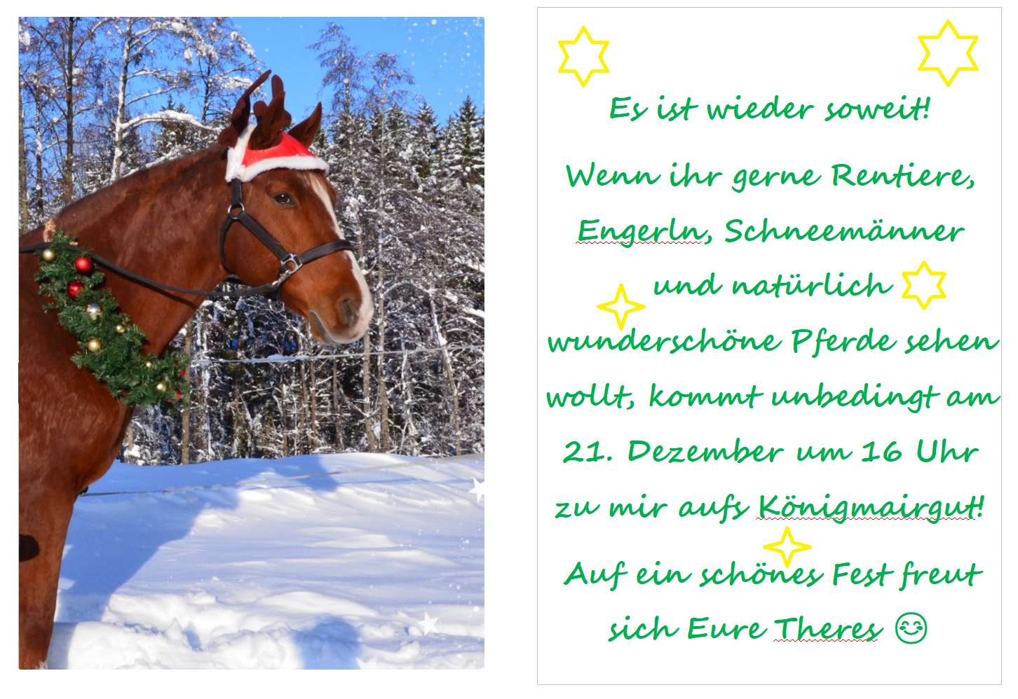 Pferdefreunde! Mein Name ist Theres Huber, ich bin staatlich geprüfte Reitinstruktorin und Pferdewirtschaftsmeisterin. 2003 habe ich mir einen langjährigen Traum erfüllt, und den Schritt zur Selbständigkeit mit meinem eigenen, schönen Reitstall gewagt. Seit meinem 10. Lebensjahr bin ich begeisterte Reiterin. Mit 16 bekam ich mein erstes Pferd: Ein Reitpony namens Frederic. Mit ihm war ich erfolgreich auf Dressurturnieren bis zur Klasse M. Nach meiner Maturaprüfung in Wien besuchte ich die LFS für Pferdewirtschaft in Lambach. Meine Praxiserfahrungen habe ich in Tirol bei der Familie Swarovski, in Bayern, in Zell am Moos und im Robinson Club Ampfelwang gesammelt. |